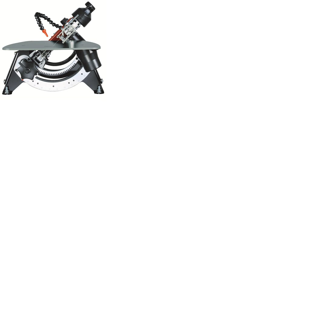 For å justere vinkelen finnes et ratt under bordet, som er låsbart i ønsket vinkel, hvor du lett justerer sagen til ønsket vinkel. Innstillingen gjøres mykt via et girsystem og dobbelt oppheng. Dette gjør at vinkel innstilling blir enkelt og meget nøyaktig. Og den kan tiltes til begge sider! Ved å trykke inn en fjærbelastet låsesplint velger du lett en av de faste vinklene på 90, 45, 22,5 eller 30 grader. En annen stor fordel er at du kan løfte opp øvre arm slik at emnet lettere kan plasseres. Spesielt hendig når du skjærer store mønster og bladet trenger å trees ofte. Når armen er løftet har du hele 165mm mellom enden av bladet og bordet! Selvsagt gjør dette det også lettere å skifte blad. Under sagen er det ingen forstyrrende deler og dette gjør at støvavsug lett kan plasseres for mest effektiv oppsamling.