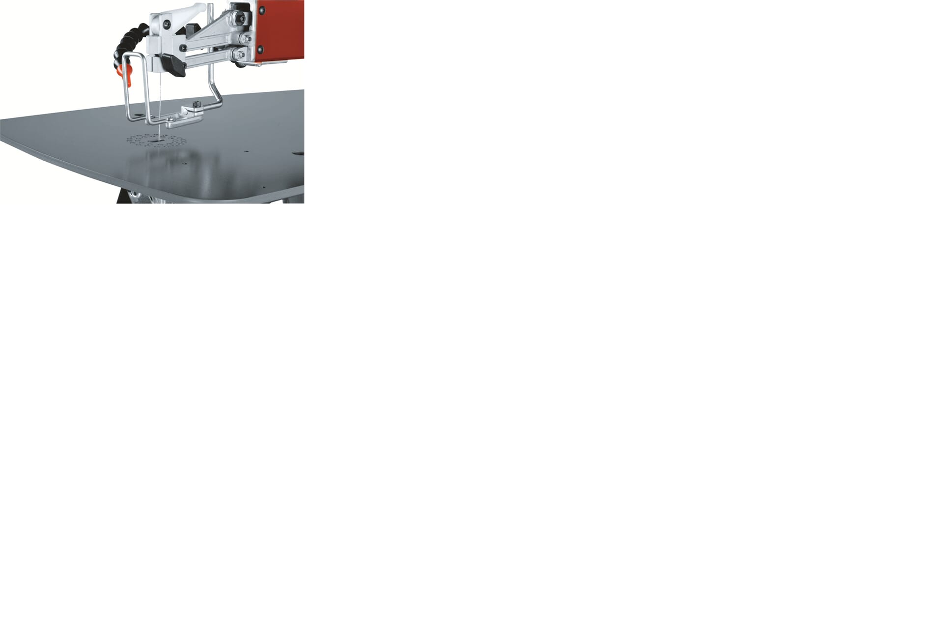 Alle viktige kontroller er å finne i fronten på øvre arm. Her finner du av/på bryter, hastighetsvelger, bladstrammer, fingeroperert bladfeste, støvblåser og lettjustert materialstøtte. Bladskifte er meget enkelt. På tuppen av armen sitter en eksentrisk låsehendel som lett strammer bladet. Grovjustering gjøres med ett stort ratt i enden av armen. Selve bladet skiftes uten bruk av verktøy. Samme stramming oppnås uten bruk av verktøy, gjør bladskifte ekstremt mye enklere og hurtigere. Det er også lett å komme til under sagen for bladskift. Den ekstra store bordplaten gjør det mulig å få plass til store emner i sagen (se tekniske opplysninger for detaljer). Dette er det beste av kontursager vi har sett! Det er ikke noen billig kontursag men her får du en topp maskin - makan har du ikke opplevd!