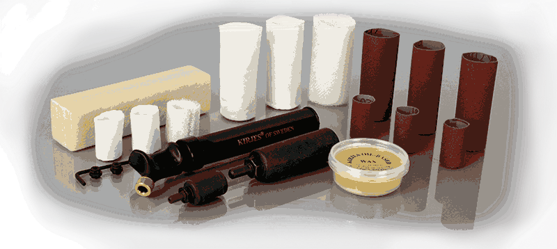 Kirjes pusse og poleringssett inneholder 2 stk rette oppblåsbare slipehylser med 3 papir i ulike korninger til hver hylse. K80, K150 og K320. Videre følger det med polerings hylser x 3 til hver dimensjon. Dobbeltvirkende pumpe til å pumpe opp slipehylsen er også inkludert. For å ta vare på slipepapiret følger det også med en effektiv rensekloss. 50ml giftfri naturvoks følger også med.