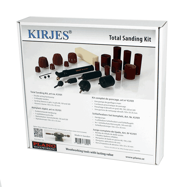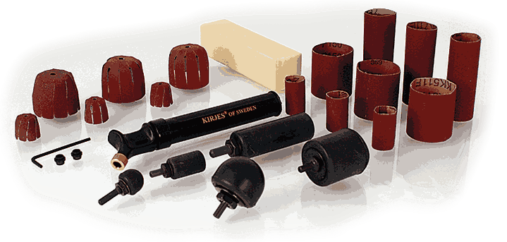 Kirjes pussesystem er basert på en rekke pusse sylindere i ulike fasonger og størrelser. Disse blåses opp med luft slik at sandpapiret låses fast på en enkel måte. Dette gjør det også raskt å skifte mellom ulike korninger. Pumpes opp med en liten dobbeltvirkende pumpe. Settet inneholder komplett utvalg av pussesylindere: