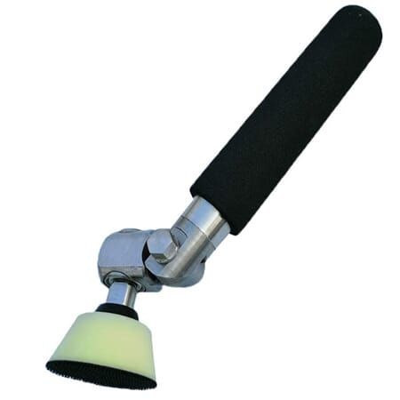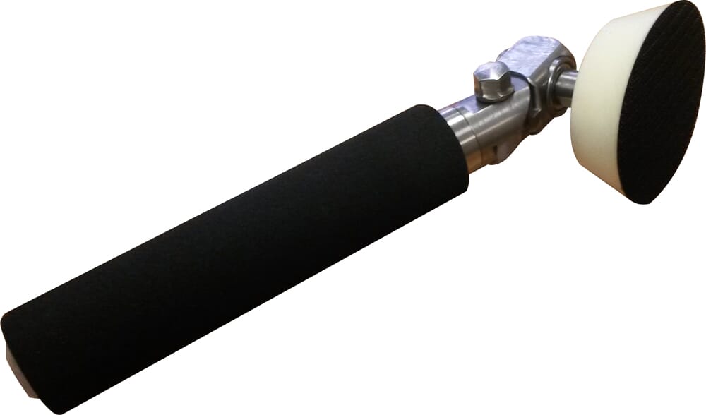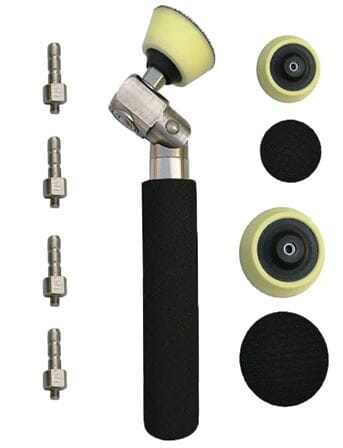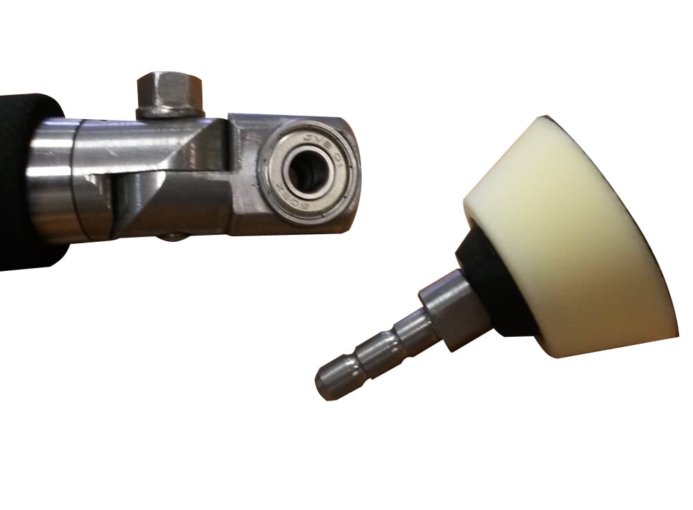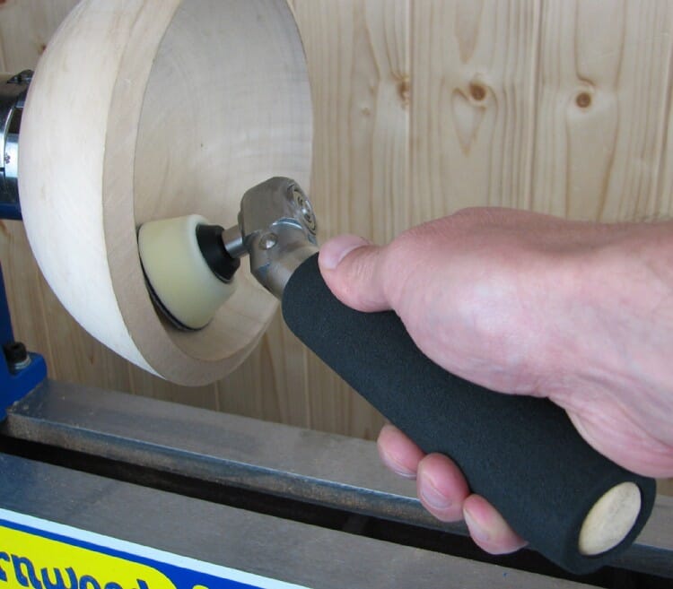 Pussesett med håndtak og 2 stk pusserondeller ø50 og ø75mm. Hodet kan justeres i ulike vinkler, drives av rotasjonen av dreiebenken når pusserondellen holdes mot f.eks bollen. Gir minimalt med pussemerker, ingen bråk, lett å komme til med.