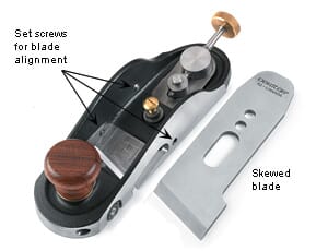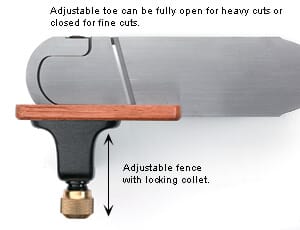 Høvelbladets justering er av typen Norris, hvor både mating (justering av bladet frem/tilbake) og sideforskyvning skjer med en hendel, og dette gjør innstillingen mye lettere og mer presis. Sideveis justering og sikring av posisjon, gjøres ved hjelp at to justeringsskruer i siden av høvelen. Innfelt i siden er det et skjærehjul som kan stilles inn for kutting av fibrene før høvelbladet kommer. Gjør en veldig god jobb på tverr ved, og forhindrer flising. Kan justeres i dybden og hvor mye den skal stikke ut. Unikt!